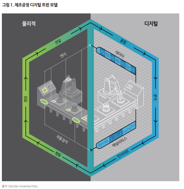 •센서: 제조공정 전반에 걸쳐 배치된 센서들이 실세계의 물리적 프로세스에 대한 운영 및 환경 정보를 포착하는 신호를 생성.