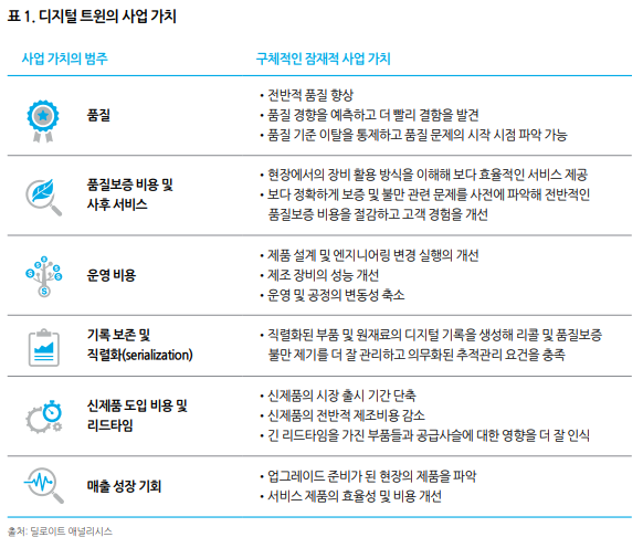디지털 트윈이 제공하는 사업적 가치를 고려할 때, 기업은 지속적으로 개선된 제품 성능, 빠른 설계 주기, 새로운 수익 흐름 잠재력, 제품보증 비용 관리 개선과 같은 전략적 성과 및 시장 동영학과 관계된 문제에 초첨을 맞춰야 한다. 이들 전략적 이슈는 디지털 트윈이 실현할 수 있는 광범위한 비즈니스 가치에 영향을 미칠 수 있는 구체적 활용방안으로 변환될 수 있다. 디지털 트윈은 가치 창출을 위한 많은 활용방안을 제공하고 기업의 사업 방식을 근본적으로 변화시킬 수 있다. 이러한 가치는 기업의 핵심 지표로 추적이 가능한 실질적인 결과로 측정 될 수 있다.