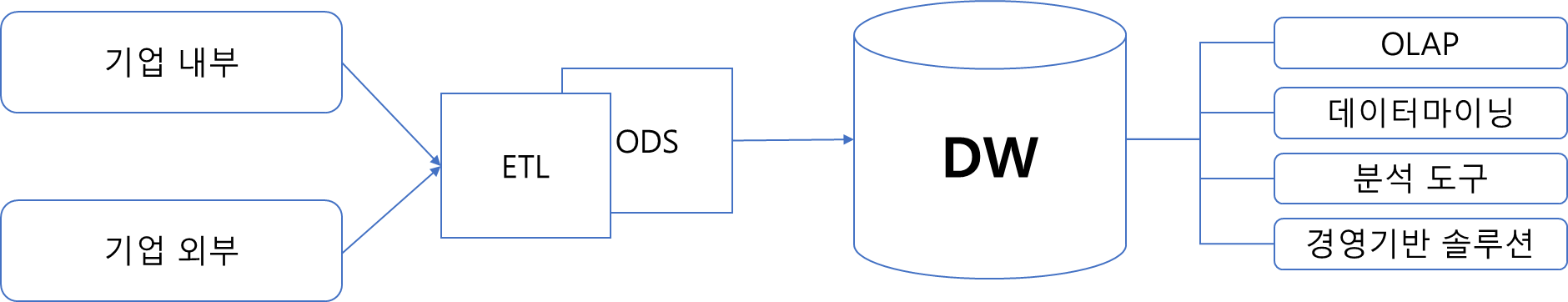 - ETL(Extract, Transform, Load) : 기업의 내부 또는 외부로부터 데이터를 추출, 정제 및 가공하여 데이터 웨어하우스에 적재