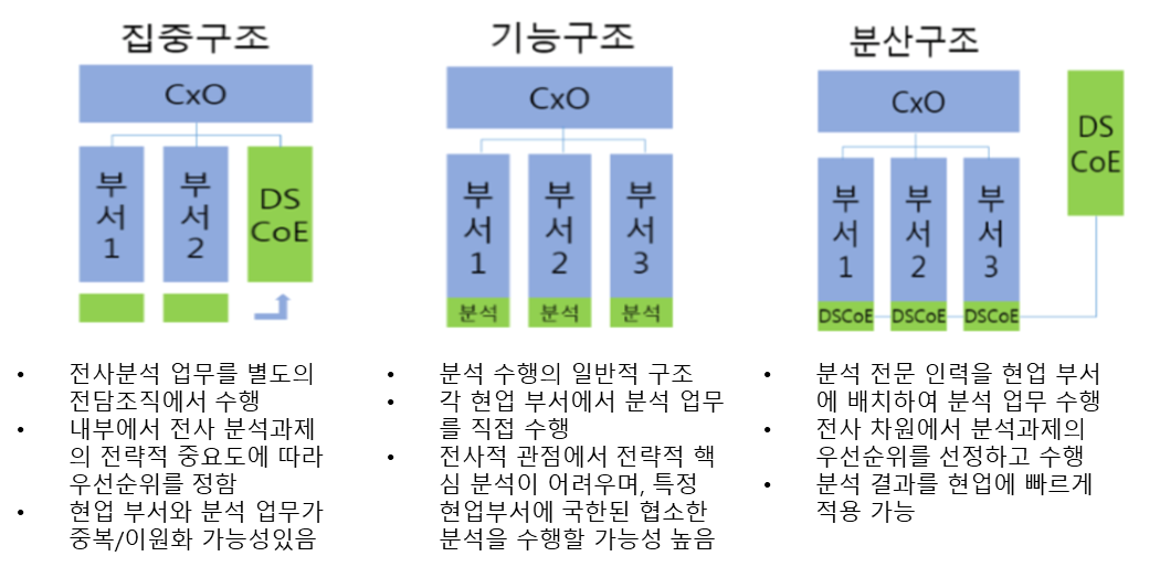 2)조직의 역할 : 전사 및 부서의 분석 업무 발굴, 빅데이터 속에서 인사이트를 찾아냄, 인사이트를 전파하고 실행