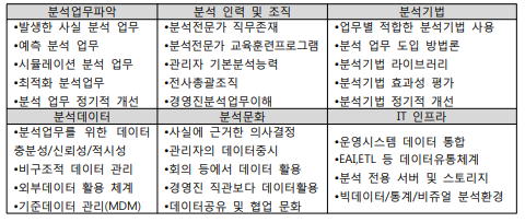 - 6개 영역의 분석 준비도와 3개 영역의 분석 성숙도를 동시에 평가할 수 있다.