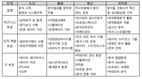 - 성숙도 수준에 따라 도입, 활용, 확산, 최적화 단계로 구분